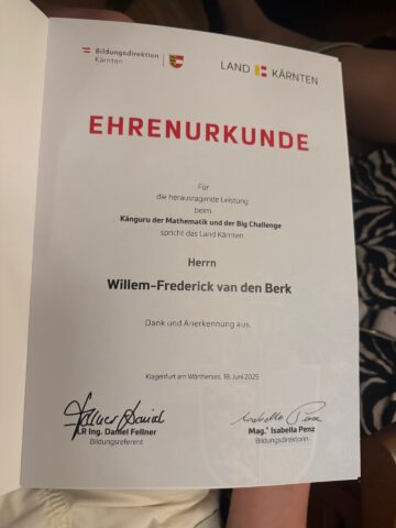 Willem-Frederick van den Berk wurde für seine herausragenden Leistungen bei zwei bedeutenden Schülerwettbewerben vom Land Kärnten geehrt. Beim internationalen Mathematikwettbewerb „Känguru der Mathematik“ und Englischwettbewerb „The Big Challenge“ überzeuge er jeweils mit dem zweiten Platz auf Landesebene. Wir sind stolz, solch talentierte Schüler*innen an unserer Schule zu haben!